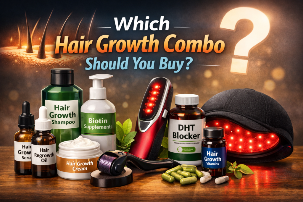 Within minutes, I was deep into articles, forums, videos, and product reviews. Words like biotin, keratin, caffeine shampoo, hair growth serum, and scalp treatment started to blur together. Every product promised transformation. Every “combo” claimed to be the missing piece.